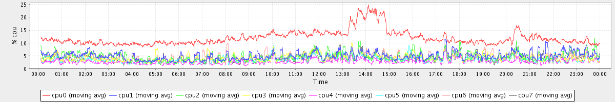 avg(cpu0) = 0.79 avg(cpu1) = 0.14 avg(cpu2) = 0.13 avg(cpu3) = 0.05 avg(cpu4) = 0.04 avg(cpu5) = 0.05 avg(cpu6) = 0.11 avg(cpu7) = 0.06