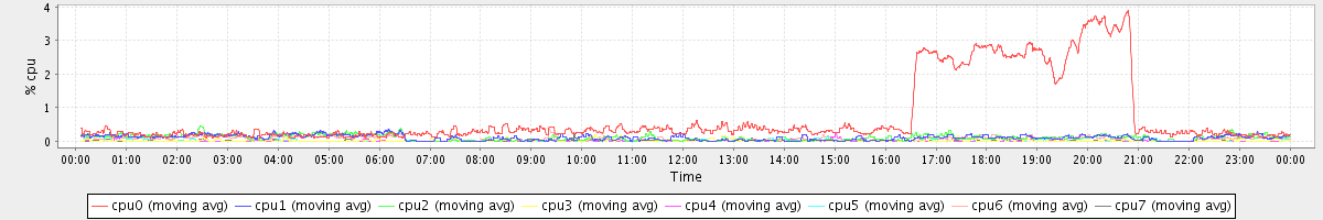 avg(cpu0) = 0.72 avg(cpu1) = 0.11 avg(cpu2) = 0.11 avg(cpu3) = 0.02 avg(cpu4) = 0.01 avg(cpu5) = 0.02 avg(cpu6) = 0.07 avg(cpu7) = 0.02