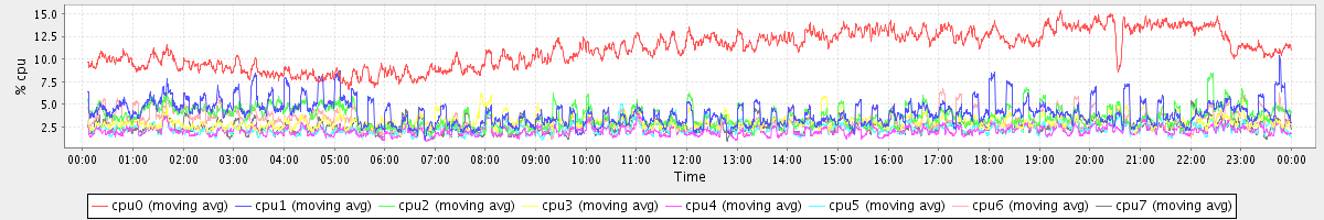 avg(cpu0) = 11.08 avg(cpu1) = 4.04 avg(cpu2) = 3.64 avg(cpu3) = 3.10 avg(cpu4) = 2.09 avg(cpu5) = 2.33 avg(cpu6) = 3.20 avg(cpu7) = 2.52