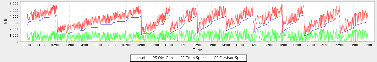 avg(total) = 3644.53 avg(PS Old Gen) = 2673.73 avg(PS Eden Space) = 908.42 avg(PS Survivor Space) = 62.37