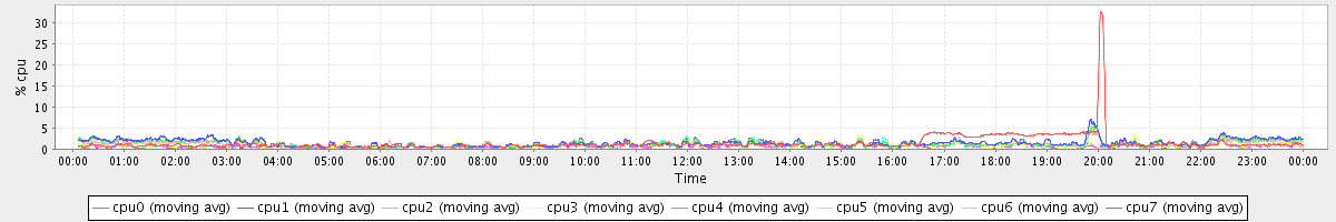 avg(cpu0) = 12.47 avg(cpu1) = 4.97 avg(cpu2) = 4.48 avg(cpu3) = 4.42 avg(cpu4) = 2.97 avg(cpu5) = 3.73 avg(cpu6) = 4.01 avg(cpu7) = 3.76