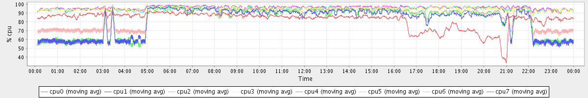 avg(cpu0) = 4.16 avg(cpu1) = 12.47 avg(cpu2) = 11.93 avg(cpu3) = 0.87 avg(cpu4) = 0.87 avg(cpu5) = 1.09 avg(cpu6) = 8.70 avg(cpu7) = 0.97
