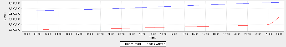 avg(pages read) = 9214979.41 avg(pages written) = 11130236.68