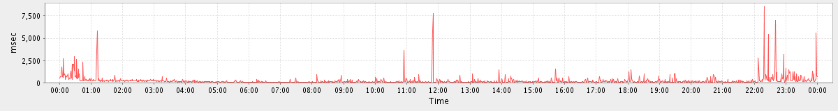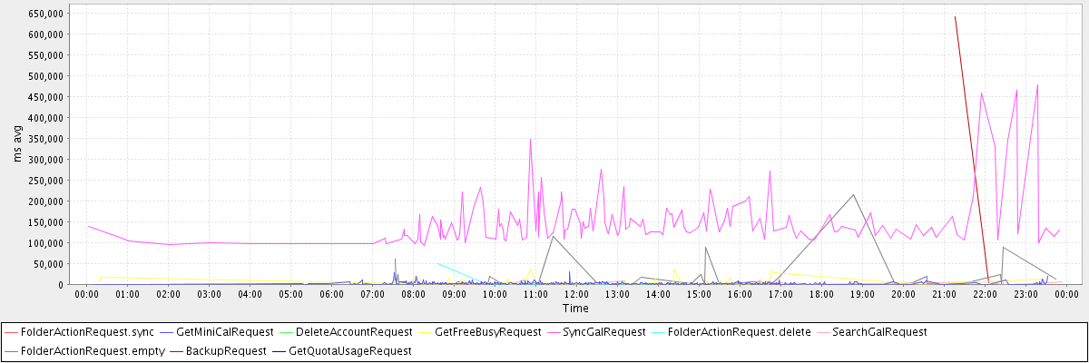 avg(FolderActionRequest.sync) = 29251.00 avg(GetMiniCalRequest) = 2143.39 avg(DeleteAccountRequest) = 9093.00 avg(GetFreeBusyRequest) = 3904.12 avg(SyncGalRequest) = 150936.61 avg(FolderActionRequest.delete) = 12636.75 avg(SearchGalRequest) = 1598.19 avg(FolderActionRequest.empty) = 16974.10 avg(BackupRequest) = 322686.00 avg(GetQuotaUsageRequest) = 2588.00