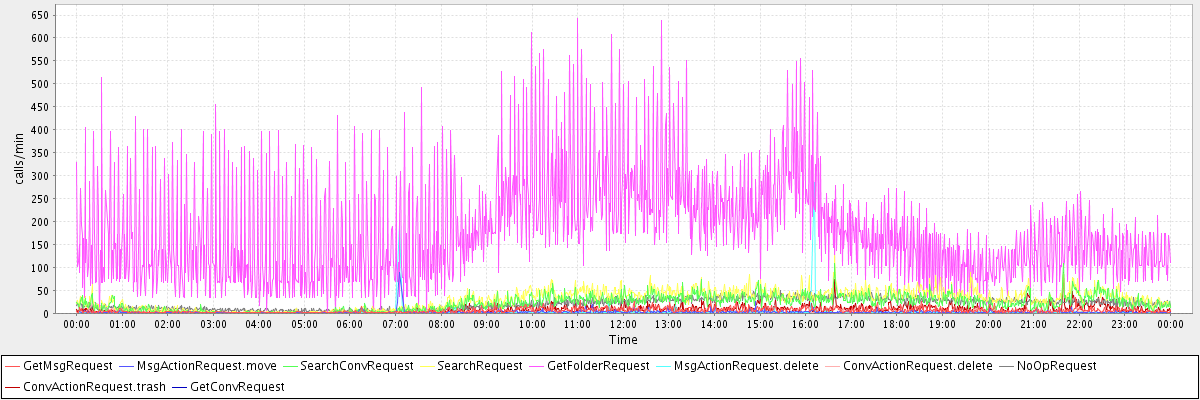 max(GetMsgRequest) = 35.00 max(MsgActionRequest.move) = 90.00 max(SearchConvRequest) = 109.00 max(SearchRequest) = 126.00 max(GetFolderRequest) = 642.00 max(MsgActionRequest.delete) = 285.00 max(ConvActionRequest.delete) = 25.00 max(NoOpRequest) = 51.00 max(ConvActionRequest.trash) = 90.00 max(GetConvRequest) = 25.00