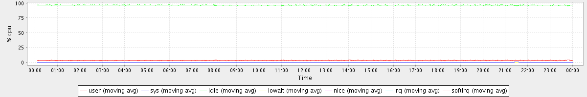 avg(user) = 3.09 avg(sys) = 0.21 avg(idle) = 96.67 avg(iowait) = 0.01 avg(nice) = 0.00 avg(irq) = 0.00 avg(softirq) = 0.00