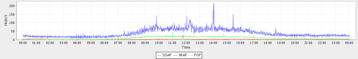 Host zm07.stanford.edu: Mailboxd: Request Rate by Client Protocol