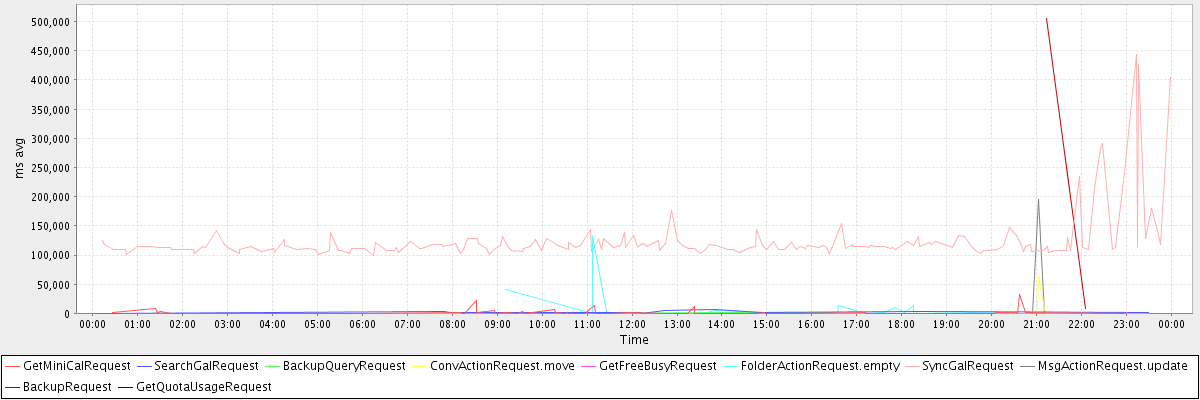 avg(GetMiniCalRequest) = 1948.85 avg(SearchGalRequest) = 2140.91 avg(BackupQueryRequest) = 676.60 avg(ConvActionRequest.move) = 747.08 avg(GetFreeBusyRequest) = 9163.00 avg(FolderActionRequest.empty) = 8516.89 avg(SyncGalRequest) = 124572.86 avg(MsgActionRequest.update) = 3567.09 avg(BackupRequest) = 256485.00 avg(GetQuotaUsageRequest) = 2388.00