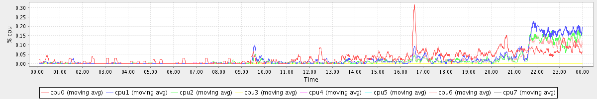avg(cpu0) = 1.19 avg(cpu1) = 1.06 avg(cpu2) = 0.92 avg(cpu3) = 0.62 avg(cpu4) = 0.45 avg(cpu5) = 0.46 avg(cpu6) = 0.74 avg(cpu7) = 0.46