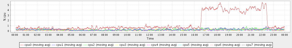 avg(cpu0) = 1.45 avg(cpu1) = 0.24 avg(cpu2) = 0.24 avg(cpu3) = 0.14 avg(cpu4) = 0.10 avg(cpu5) = 0.10 avg(cpu6) = 0.17 avg(cpu7) = 0.10