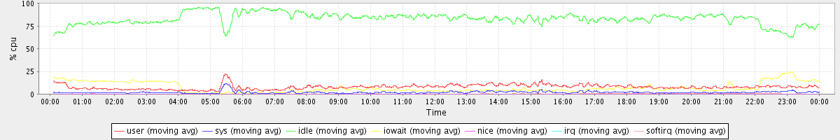 avg(user) = 7.76 avg(sys) = 1.86 avg(idle) = 83.13 avg(iowait) = 6.94 avg(nice) = 0.00 avg(irq) = 0.04 avg(softirq) = 0.28