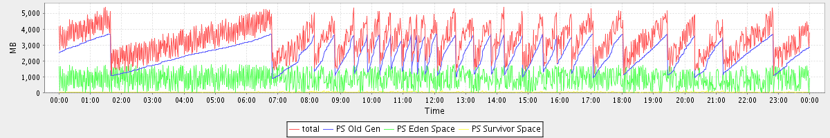 avg(total) = 3310.34 avg(PS Old Gen) = 2397.06 avg(PS Eden Space) = 875.13 avg(PS Survivor Space) = 38.15