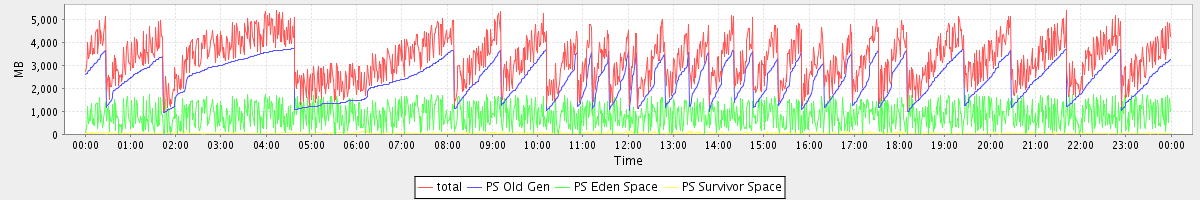 avg(total) = 3259.85 avg(PS Old Gen) = 2371.97 avg(PS Eden Space) = 842.79 avg(PS Survivor Space) = 45.08