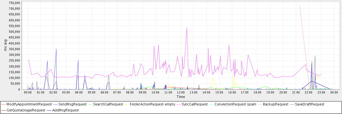avg(ModifyAppointmentRequest) = 1694.54 avg(SendMsgRequest) = 2583.14 avg(SearchGalRequest) = 5218.14 avg(FolderActionRequest.empty) = 8003.36 avg(SyncGalRequest) = 167249.16 avg(ConvActionRequest.spam) = 1390.45 avg(BackupRequest) = 363897.00 avg(SaveDraftRequest) = 3053.21 avg(GetQuotaUsageRequest) = 2504.00 avg(AddMsgRequest) = 1352.94