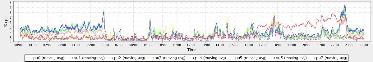 avg(cpu0) = 1.01 avg(cpu1) = 0.17 avg(cpu2) = 0.15 avg(cpu3) = 0.03 avg(cpu4) = 0.02 avg(cpu5) = 0.02 avg(cpu6) = 0.11 avg(cpu7) = 0.03