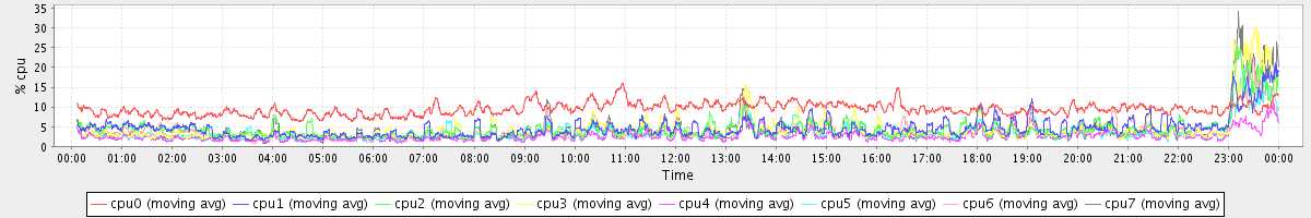avg(cpu0) = 9.45 avg(cpu1) = 4.66 avg(cpu2) = 4.57 avg(cpu3) = 4.56 avg(cpu4) = 2.67 avg(cpu5) = 3.41 avg(cpu6) = 3.88 avg(cpu7) = 3.90