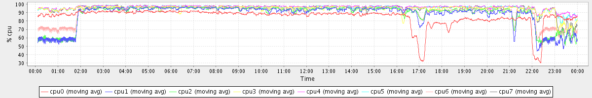 avg(cpu0) = 85.15 avg(cpu1) = 87.43 avg(cpu2) = 88.41 avg(cpu3) = 94.63 avg(cpu4) = 96.67 avg(cpu5) = 96.06 avg(cpu6) = 90.81 avg(cpu7) = 95.22
