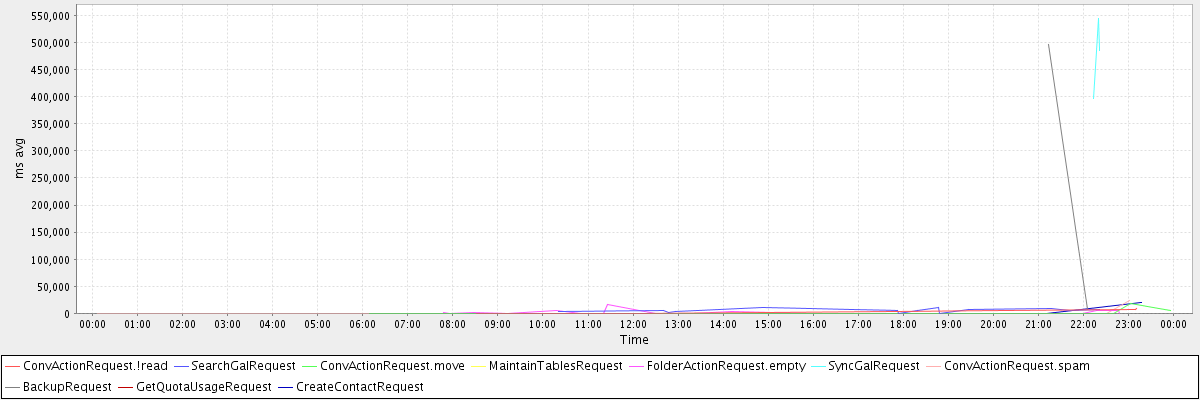avg(ConvActionRequest.!read) = 2684.33 avg(SearchGalRequest) = 5345.14 avg(ConvActionRequest.move) = 730.91 avg(MaintainTablesRequest) = 235552.00 avg(FolderActionRequest.empty) = 1394.93 avg(SyncGalRequest) = 474951.00 avg(ConvActionRequest.spam) = 2687.00 avg(BackupRequest) = 251584.00 avg(GetQuotaUsageRequest) = 2527.00 avg(CreateContactRequest) = 1911.09