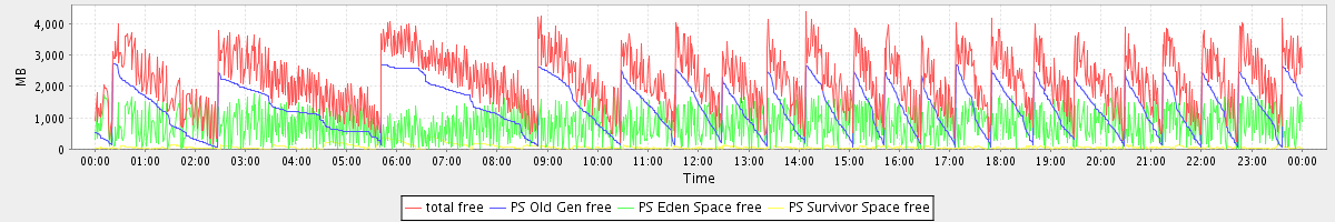 avg(total free) = 2197.78 avg(PS Old Gen free) = 1329.60 avg(PS Eden Space free) = 801.37 avg(PS Survivor Space free) = 66.81