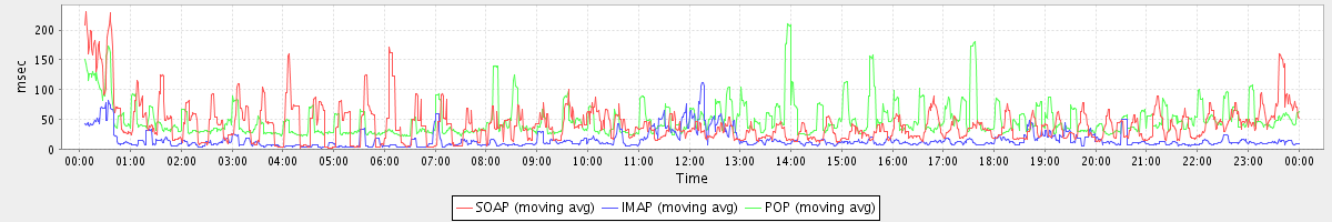 max(GetMsgRequest) = 53.00 max(SearchConvRequest) = 72.00 max(GetFolderRequest) = 382.00 max(SearchRequest) = 83.00 max(NoOpRequest) = 46.00 max(GetInfoRequest) = 19.00 max(ConvActionRequest.trash) = 47.00 max(FolderActionRequest.move) = 36.00 max(AuthRequest) = 18.00 max(GetAppointmentRequest) = 41.00