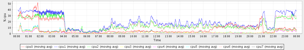 avg(cpu0) = 21.57 avg(cpu1) = 11.36 avg(cpu2) = 10.43 avg(cpu3) = 9.38 avg(cpu4) = 8.21 avg(cpu5) = 9.34 avg(cpu6) = 10.66 avg(cpu7) = 9.98
