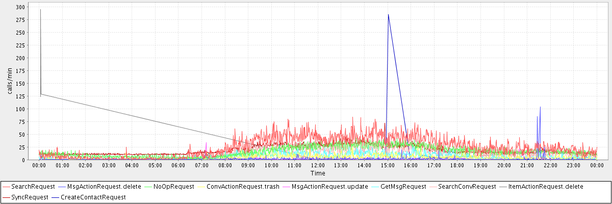max(SearchRequest) = 84.00 max(MsgActionRequest.delete) = 104.00 max(NoOpRequest) = 43.00 max(ConvActionRequest.trash) = 32.00 max(MsgActionRequest.update) = 38.00 max(GetMsgRequest) = 32.00 max(SearchConvRequest) = 62.00 max(ItemActionRequest.delete) = 295.00 max(SyncRequest) = 72.00 max(CreateContactRequest) = 285.00