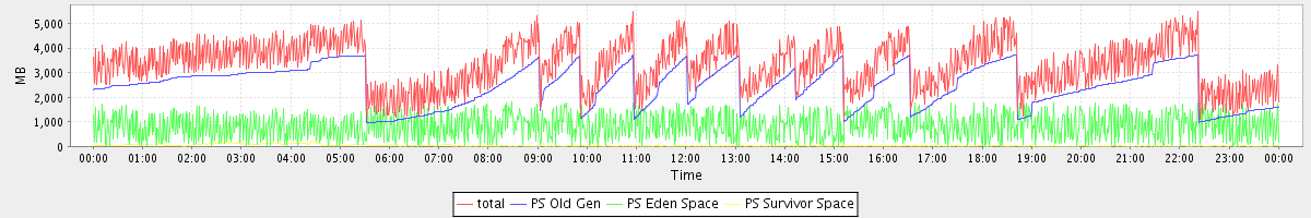 avg(total) = 3329.68 avg(PS Old Gen) = 2461.66 avg(PS Eden Space) = 833.44 avg(PS Survivor Space) = 34.58