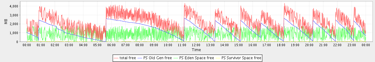 avg(total free) = 2216.39 avg(PS Old Gen free) = 1319.91 avg(PS Eden Space free) = 875.27 avg(PS Survivor Space free) = 21.20