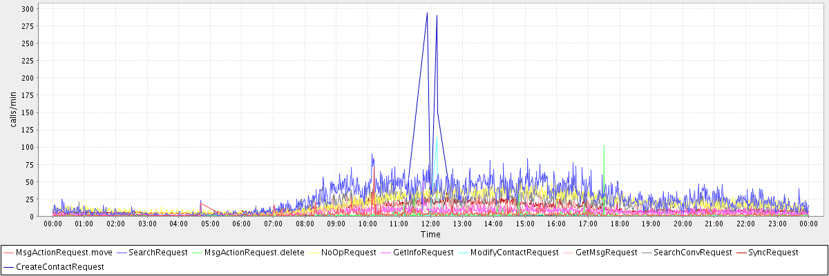 max(MsgActionRequest.move) = 71.00 max(SearchRequest) = 91.00 max(MsgActionRequest.delete) = 103.00 max(NoOpRequest) = 50.00 max(GetInfoRequest) = 53.00 max(ModifyContactRequest) = 114.00 max(GetMsgRequest) = 38.00 max(SearchConvRequest) = 54.00 max(SyncRequest) = 34.00 max(CreateContactRequest) = 294.00