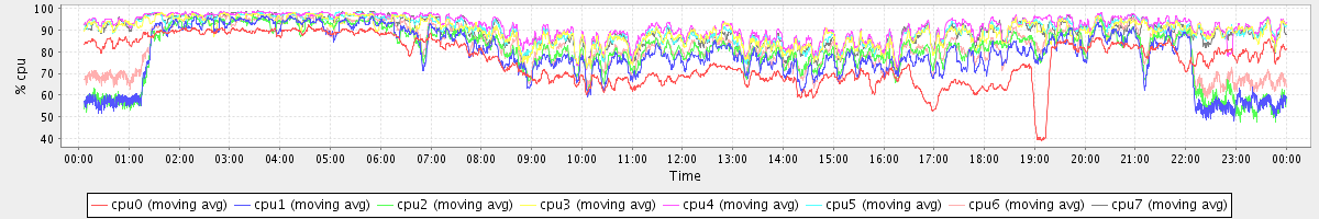 avg(cpu0) = 16.13 avg(cpu1) = 7.64 avg(cpu2) = 7.27 avg(cpu3) = 6.87 avg(cpu4) = 5.23 avg(cpu5) = 6.30 avg(cpu6) = 7.07 avg(cpu7) = 6.63