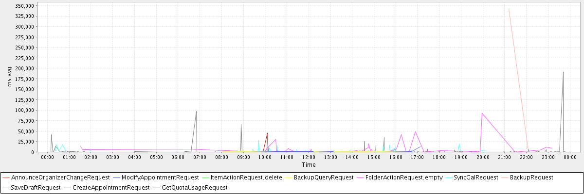 avg(AnnounceOrganizerChangeRequest) = 1177.00 avg(ModifyAppointmentRequest) = 940.29 avg(ItemActionRequest.delete) = 1442.00 avg(BackupQueryRequest) = 1003.00 avg(FolderActionRequest.empty) = 7345.06 avg(SyncGalRequest) = 2551.84 avg(BackupRequest) = 172883.50 avg(SaveDraftRequest) = 971.12 avg(CreateAppointmentRequest) = 1540.65 avg(GetQuotaUsageRequest) = 2486.00