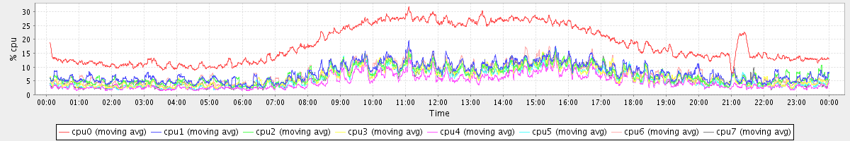 avg(cpu0) = 18.09 avg(cpu1) = 8.03 avg(cpu2) = 7.15 avg(cpu3) = 6.52 avg(cpu4) = 4.71 avg(cpu5) = 6.04 avg(cpu6) = 7.49 avg(cpu7) = 6.37