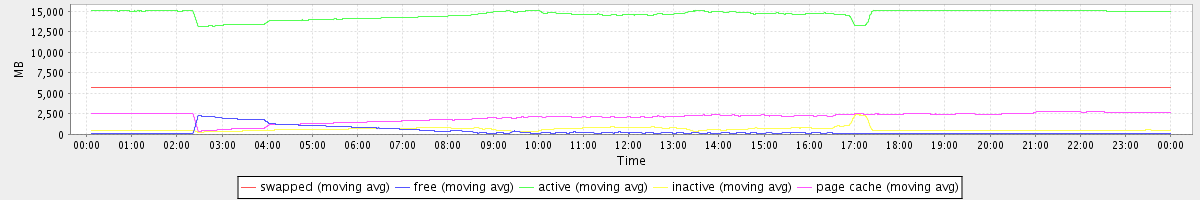 avg(swapped) = 5735.72 avg(free) = 366.31 avg(active) = 14631.96 avg(inactive) = 627.67 avg(page cache) = 2108.10