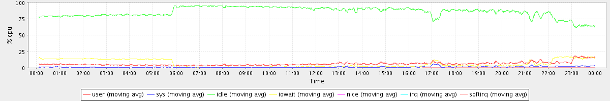 avg(user) = 6.09 avg(sys) = 1.18 avg(idle) = 85.99 avg(iowait) = 6.47 avg(nice) = 0.00 avg(irq) = 0.03 avg(softirq) = 0.24