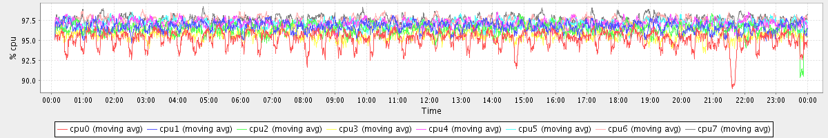 avg(cpu0) = 95.21 avg(cpu1) = 96.74 avg(cpu2) = 96.40 avg(cpu3) = 95.80 avg(cpu4) = 97.04 avg(cpu5) = 97.00 avg(cpu6) = 97.32 avg(cpu7) = 97.51