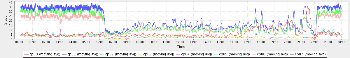 avg(cpu0) = 6.06 avg(cpu1) = 20.72 avg(cpu2) = 16.86 avg(cpu3) = 2.18 avg(cpu4) = 2.24 avg(cpu5) = 2.87 avg(cpu6) = 14.89 avg(cpu7) = 2.43