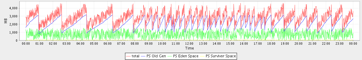 avg(total) = 2883.38 avg(PS Old Gen) = 2108.83 avg(PS Eden Space) = 755.93 avg(PS Survivor Space) = 18.63
