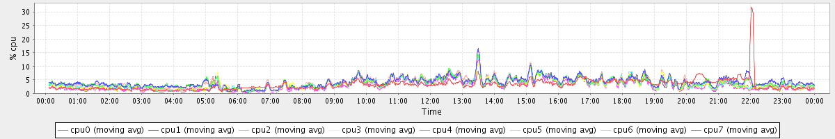avg(cpu0) = 1.36 avg(cpu1) = 0.31 avg(cpu2) = 0.28 avg(cpu3) = 0.14 avg(cpu4) = 0.13 avg(cpu5) = 0.13 avg(cpu6) = 0.24 avg(cpu7) = 0.14