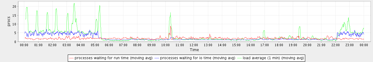 avg(processes waiting for run time) = 0.87 avg(processes waiting for io time) = 1.54 avg(load average (1 min)) = 3.39