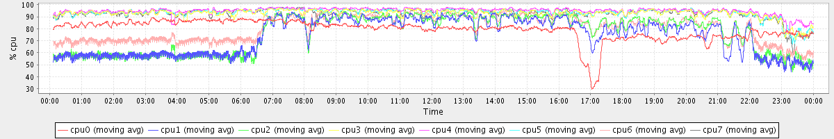 avg(cpu0) = 79.28 avg(cpu1) = 74.17 avg(cpu2) = 76.14 avg(cpu3) = 92.73 avg(cpu4) = 94.85 avg(cpu5) = 93.23 avg(cpu6) = 80.58 avg(cpu7) = 92.77