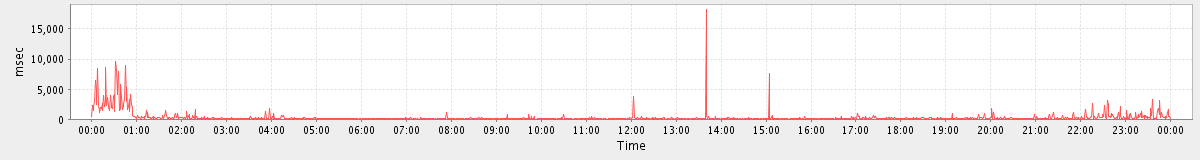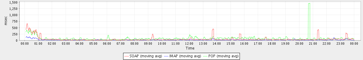 avg(ConvActionRequest.read) = 1101.42 avg(SendMsgRequest) = 496.75 avg(ConvActionRequest.delete) = 1074.36 avg(BackupQueryRequest) = 928.00 avg(FolderActionRequest.empty) = 11114.97 avg(SyncGalRequest) = 15083.80 avg(BackupRequest) = 407669.00 avg(SaveDraftRequest) = 379.03 avg(MsgActionRequest.flag) = 884.88 avg(GetQuotaUsageRequest) = 2578.00