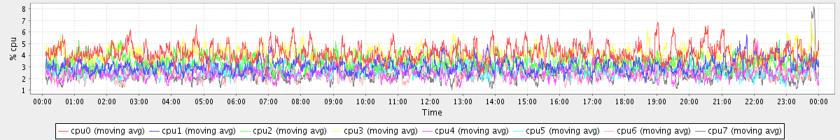 avg(cpu0) = 4.18 avg(cpu1) = 3.08 avg(cpu2) = 3.35 avg(cpu3) = 3.99 avg(cpu4) = 2.54 avg(cpu5) = 2.73 avg(cpu6) = 2.54 avg(cpu7) = 2.43