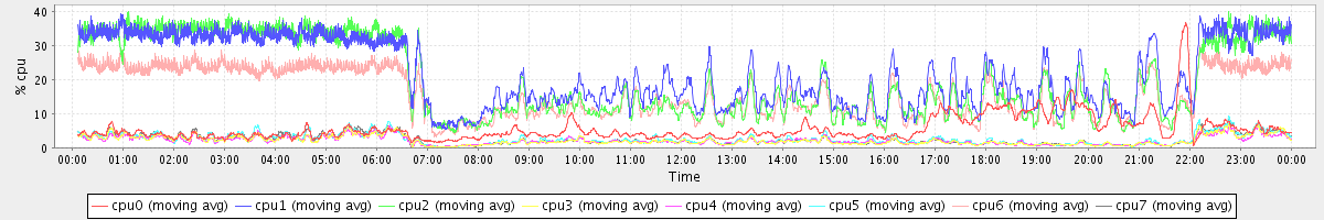 avg(cpu0) = 5.58 avg(cpu1) = 21.83 avg(cpu2) = 19.89 avg(cpu3) = 2.19 avg(cpu4) = 2.13 avg(cpu5) = 2.59 avg(cpu6) = 15.82 avg(cpu7) = 2.48
