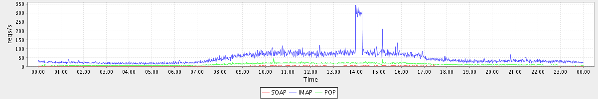 max(GetMsgRequest) = 43.00 max(MsgActionRequest.move) = 377.00 max(SearchConvRequest) = 66.00 max(SearchRequest) = 162.00 max(GetFolderRequest) = 32.00 max(MsgActionRequest.delete) = 530.00 max(NoOpRequest) = 60.00 max(SyncRequest) = 73.00 max(GetInfoRequest) = 33.00 max(ConvActionRequest.trash) = 37.00
