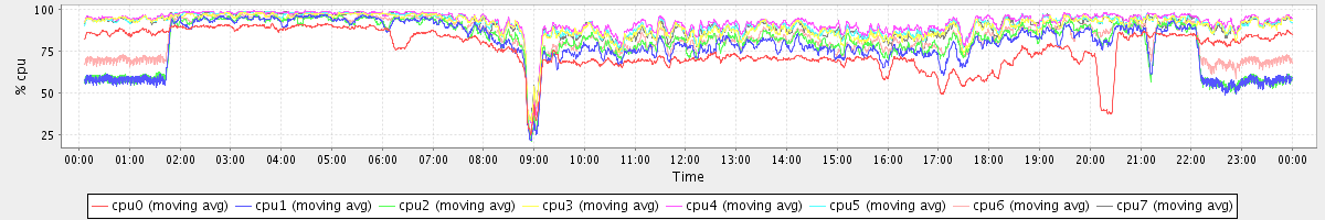 avg(cpu0) = 16.23 avg(cpu1) = 7.29 avg(cpu2) = 6.97 avg(cpu3) = 6.21 avg(cpu4) = 4.51 avg(cpu5) = 5.48 avg(cpu6) = 6.33 avg(cpu7) = 5.86