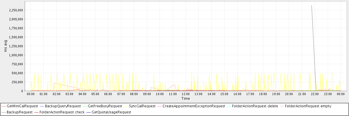 avg(GetMiniCalRequest) = 5193.08 avg(BackupQueryRequest) = 1237.57 avg(GetFreeBusyRequest) = 5496.46 avg(SyncGalRequest) = 52954.76 avg(CreateAppointmentExceptionRequest) = 1283.14 avg(FolderActionRequest.delete) = 3579.50 avg(FolderActionRequest.empty) = 17876.80 avg(BackupRequest) = 1194012.00 avg(FolderActionRequest.check) = 2193.25 avg(GetQuotaUsageRequest) = 2624.00