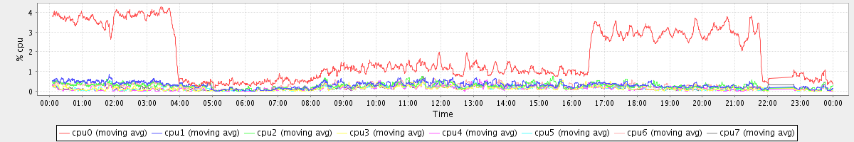 avg(cpu0) = 1.82 avg(cpu1) = 0.31 avg(cpu2) = 0.27 avg(cpu3) = 0.14 avg(cpu4) = 0.14 avg(cpu5) = 0.13 avg(cpu6) = 0.25 avg(cpu7) = 0.14