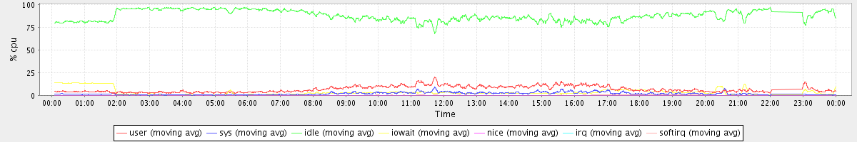 avg(user) = 6.77 avg(sys) = 1.93 avg(idle) = 87.59 avg(iowait) = 3.51 avg(nice) = 0.00 avg(irq) = 0.02 avg(softirq) = 0.18
