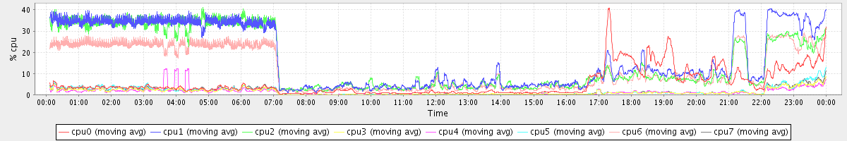 avg(cpu0) = 5.47 avg(cpu1) = 17.60 avg(cpu2) = 15.80 avg(cpu3) = 1.35 avg(cpu4) = 1.30 avg(cpu5) = 1.68 avg(cpu6) = 12.13 avg(cpu7) = 1.60
