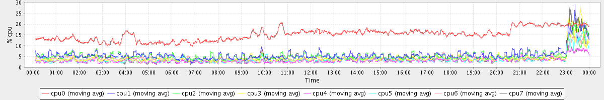 avg(cpu0) = 15.08 avg(cpu1) = 5.76 avg(cpu2) = 5.36 avg(cpu3) = 4.30 avg(cpu4) = 3.18 avg(cpu5) = 3.53 avg(cpu6) = 4.28 avg(cpu7) = 3.73